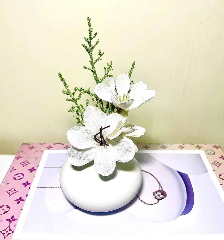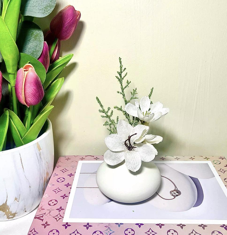 فازات ورد صناعي صغيرة وأنيقة، تأتي بتصميم بيضاوي فخم يناسب طاولات الخدمة والمكاتب، وتضفي لمسة فنية راقية على أي مساحة.